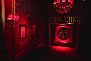 Derrière la devanture de Babouchka, une fois le porche franchi, la lumière tamisée donne le ton. On descend à pas feutrés l’escalier, comme si l’on entrait dans une maison d’hiver, chaleureuse, le regard captivé par une foule de détails : tableaux, vitraux, tissus brodés, lustres majestueux et bois sculptés. Un second palier mène à la salle principale, écarlate, de velours rouge vêtue. Impossible de résister à l’âme chic et festive qui en émane.